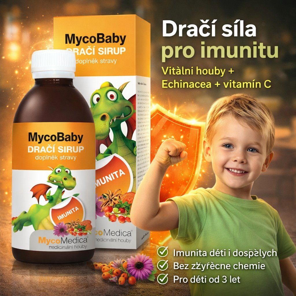 SEO otázky a odpovědiJak podpořit imunitu dětí přírodní cestou?Základem je pestrá strava, dostatek spánku, pohyb a vhodně zvolený doplněk stravy. MycoBaby Dračí sirup kombinuje Reishi, Cordyceps, Echinaceu a vitamín C v praktické sirupové formě. Co obsahuje MycoBaby Dračí sirup?Sirup obsahuje extrakty z vitálních hub Reishi a Cordyceps, Echinaceu, Acerolu, vitamín C, holandské kakao a hroznový sirup. Je MycoBaby Dračí sirup vhodný při častém nachlazení?Produkt bývá vyhledáván právě v obdobích zvýšené zátěže a častějších sezonních výzev. Důležité je dodržovat doporučené dávkování a celkově podporovat zdravý režim dítěte. Jak dávkovat Dračí sirup dětem?Dětem od 3 do 7 let se podává 5 ml 1–3× denně, od 7 let 5 ml 2–6× denně. Odměrka je součástí balení. |