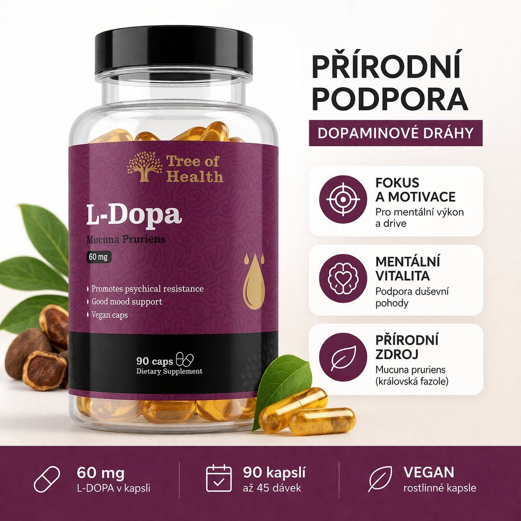 L-DOPA (levodopa) je přirozený prekurzor dopaminu – neurotransmiteru spojovaného s motivací, soustředěním a mentální vitalitou. V produktu Tree of Health pochází z prémiového extraktu Mucuna pruriens, tradičně využívaného v ájurvédské praxi.